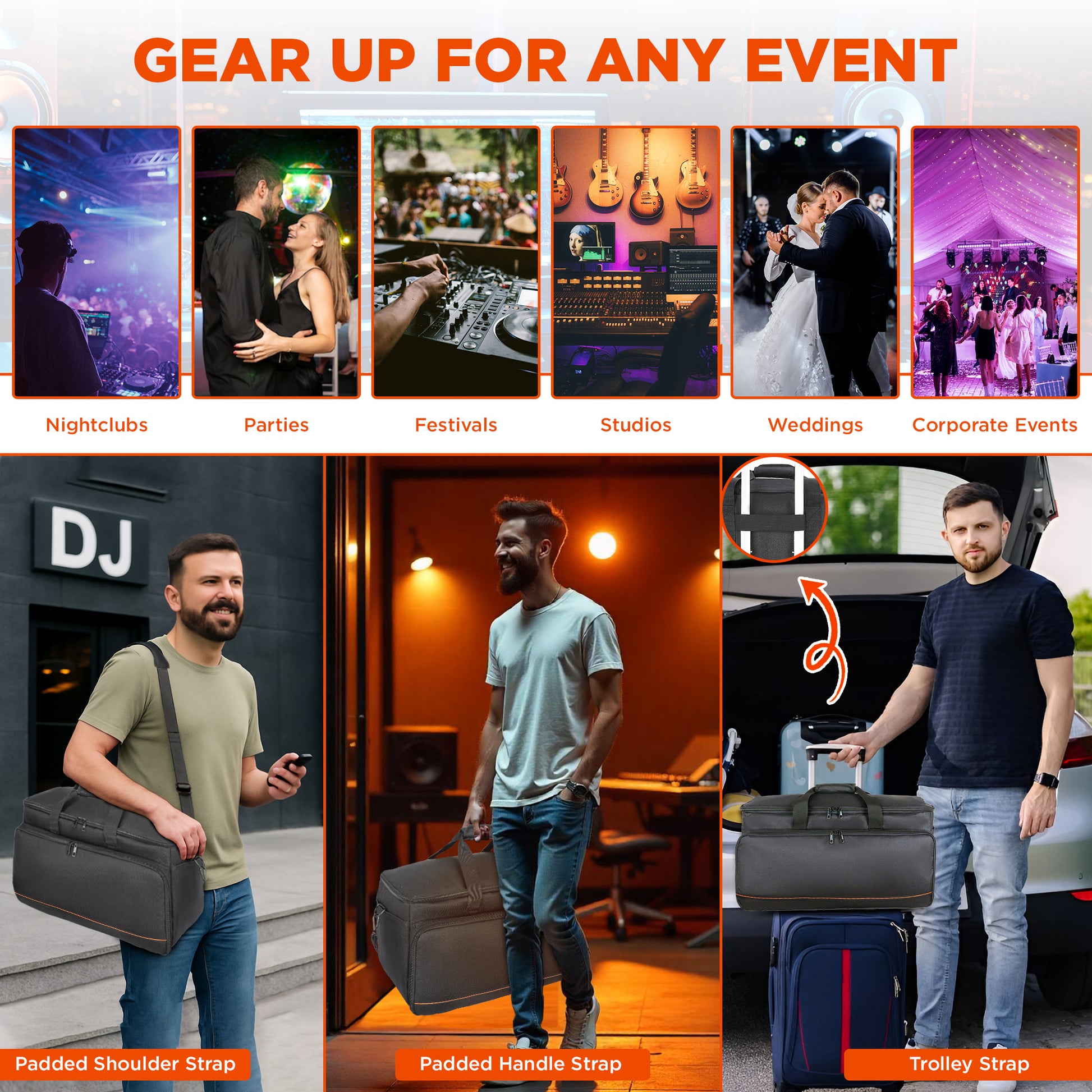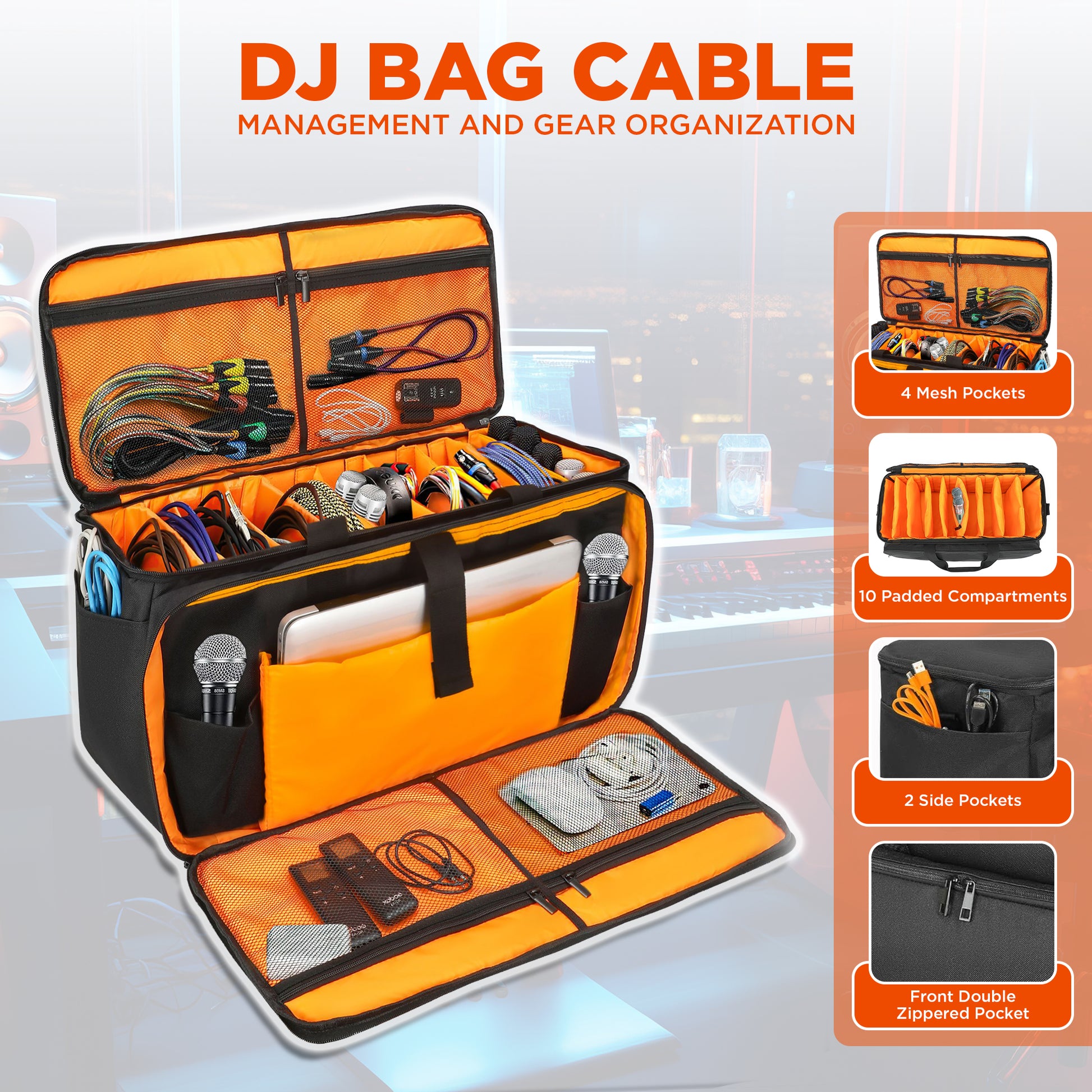 - High Capacity Main Compartment: 21” W x 11” D x 11.5” H. 43 liters of volume gives you enough storage for electronics, gear, clothing and more. Hook & Loop Interior allows you to fasten dividers, admin panels and accessories. This DJ bag can hold dozens of cables, cords, power supplies, pedals, controllers, and more.